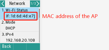 Method 1: Go to Menu > Status > Network, it shows the AP’s SSID and MAC address.
